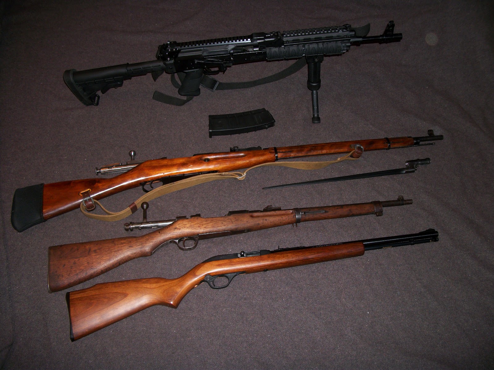 Top wooden stocked rifle - Mosin Nagant 91/30 made in the Tula armory circa 1943. This one is the killer, all of them during that time frame were issued to Russian troops who then went on to face down the Wehrmacht. Every existing Mosin made before 1945 has likely had a Nazi in its sights. The bayonet underneath goes with this rifle. Anyone up for shishkabob?